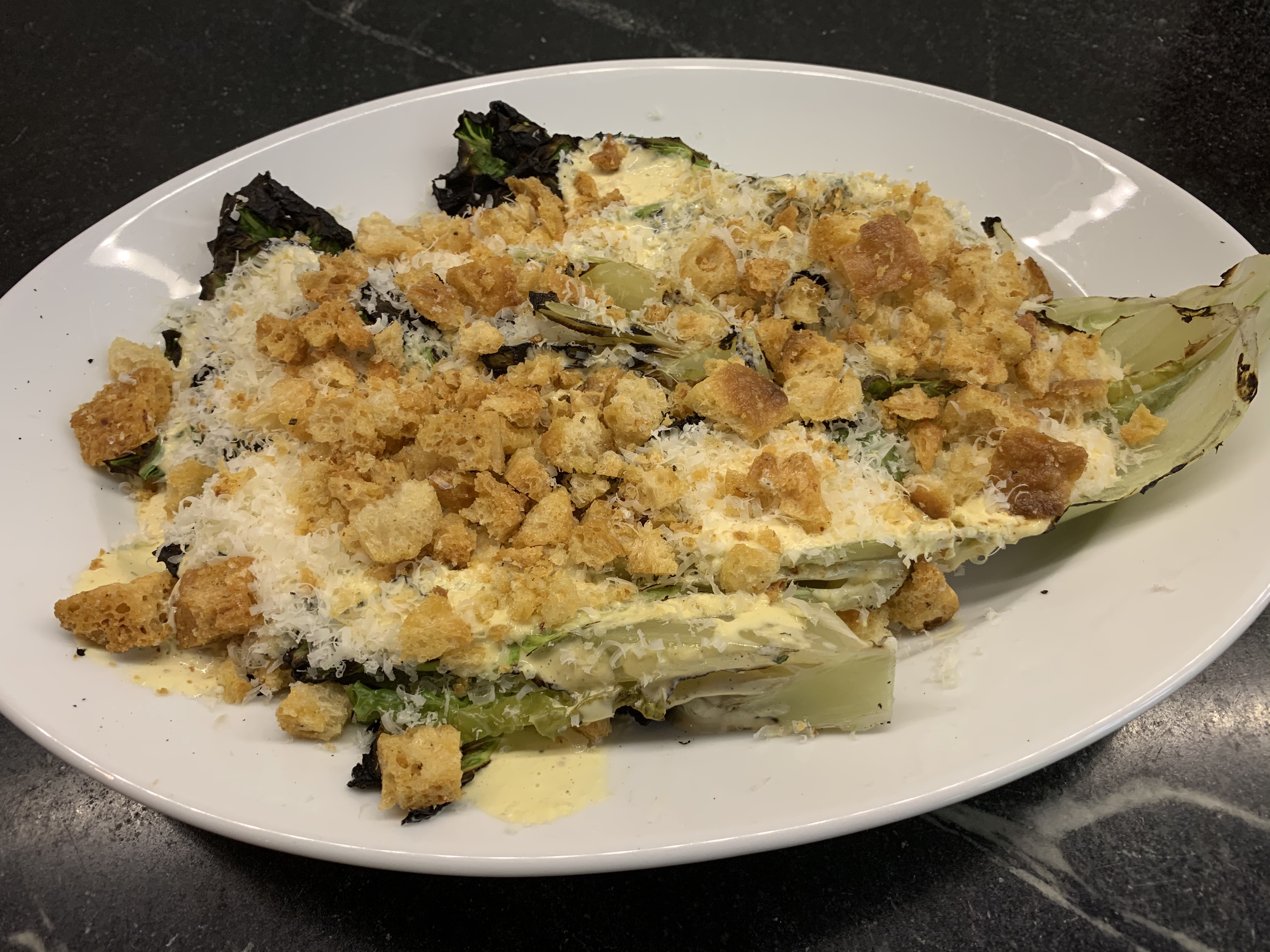 Place the lettuce on a grill over medium high heat and cook for 30 seconds to 1 minute until it is just beginning to char. Turn and repeat on the other side.