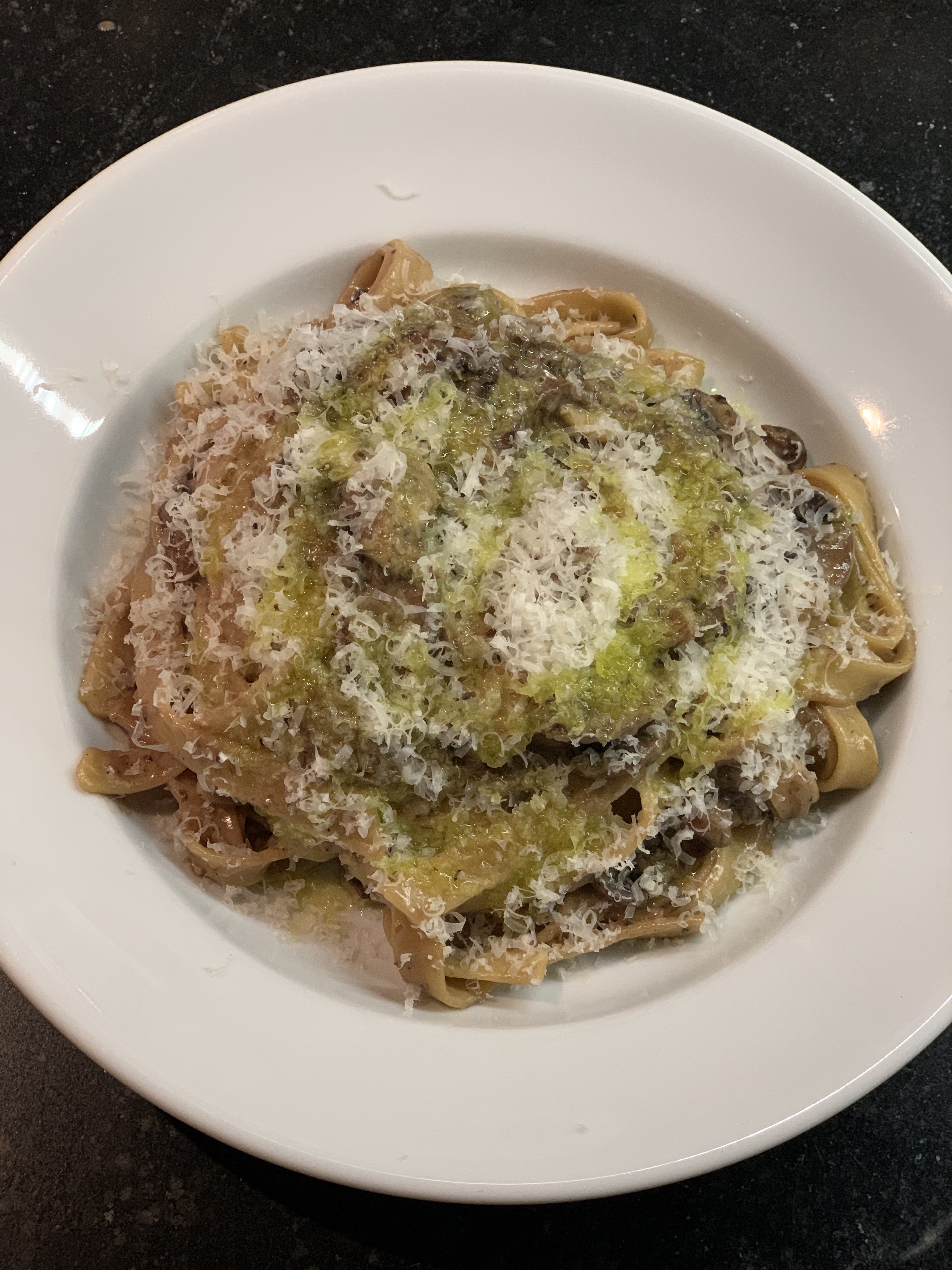 When the pasta is ready (al dente), return the mushrooms to medium heat and add an additional ¼ cup of porcini liquid and the cream.